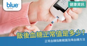 糖尿病一向多發於中老年人,不過,近年隨著生活方式改變以及生活壓力增加,越來越多年輕人被診斷出患上糖尿病。到底飯後血糖正常值是多少?Blue健康達人以下為大家說明正常血糖指數的範圍,並介紹降血糖最快的方法。 什麼是糖尿病? 糖尿病逐漸年輕化,已成為全球公共衛生面臨的一大挑戰。糖尿病是一種由於胰島素分泌不足、或身體對胰島素的反應異常所引起的代謝性疾病。胰島素是由胰臟分泌出來的激素,主要作用是促進肝臟和肌肉細胞將血液中的葡萄糖轉化為肝糖,以作為身體的能量儲備,同時避免葡萄糖停留在血液中導致身體處於高血糖水平,損害各個器官。當胰島素功能失常時,血糖無法有效進入細胞,導致血糖指數過高,從而引發糖尿病。 糖尿病主要分為兩種類型,一型糖尿病患者的數量遠遠少於二型糖尿病患者。根據美國疾病控制與預防中心(CDC)的數據,一型糖尿病佔所有已診斷糖尿病病例的約 5.8 %,而二型糖尿病則佔高達 9 成。雖然一型糖尿病患者較少,但他們面臨的併發症可能更為嚴重,例如會出現心血管疾病、視力問題、神經損傷、腎臟問題等嚴重併發症。 延伸閱讀:小便有泡原因是腎功能受損?了解蛋白尿原因及改善方法 一型糖尿病 一般發生在兒童或青少年身上,一型糖尿病是由於胰臟的 β 細胞被自身的免疫系統錯誤攻擊,造成胰島素分泌出現問題。這類型的糖尿病患者需要終生注射胰島素,以防止血糖過高。 二型糖尿病 主要發生在成年人,特別是中老年人。二型糖尿病通常與遺傳、肥胖、缺乏運動和不良飲食習慣有關。雖然胰臟仍能分泌胰島素,但身體對胰島素的反應降低,導致血糖無法維持在正常血糖指數範圍內。身體為了控制過高的血糖而必須分泌更多胰島素,形成惡性循環。然而與一型糖尿病不同,早期的二型糖尿病能夠憑改善飲食及生活習慣,抑止惡化甚至痊癒。 妊娠糖尿病 由於妊娠期間身體於荷爾蒙分泌、體重及血糖上都有變化,導致可能需要分泌更多胰島素去控制血糖,因此女性懷孕期間有可能暫時患上糖尿病。雖然大部分會在分娩後恢復正常,但也有可能增加日後患上糖尿病的風險。 糖尿病症狀 糖尿病的症狀可能因人而異,而常見的徵兆包括: 尿頻與口渴 糖尿病患者經常會感到口渴,並且需要頻繁上廁所。這是由於血糖並非處於正常值時,腎臟需要更多的水分來排出多餘的葡萄糖,從而導致排尿增加。 極度疲倦 由於身體無法有效利用血液中的葡萄糖,導致能量不足,令到患者可能感到持續疲倦或無力。 體重減輕 雖然患者的食量可能未減少,但由於葡萄糖無法換成能量,身體會開始分解脂肪和肌肉來提供能量,可能導致乍看原因不明的體重減輕。 視力模糊 血糖指數高會引起體液不平衡,改變眼球內部的壓力,可能會對眼睛的晶體造成影響,導致視力模糊。 傷口癒合緩慢 糖尿病患者的免疫系統可能會受到影響,導致傷口或感染難以癒合。 飯後血糖正常值應該是多少? 很多有糖尿病風險的人都會好奇,究竟飯後血糖正常值是多少?飯後血糖指數反映餐後兩小時內,身體如何處理和調節血液中的葡萄糖。所以,了解血糖正常值對於預防糖尿病及維持健康非常重要。 研究表示,正常的飯後血糖值應低於 7.8 mmol/L(指餐後兩小時測得的血糖指數)。如果飯後血糖超過 7.8 mmol/L 但未達到 11.1 mmol/L,則表示可能處於糖尿病前期,需要積極調整飲食和生活習慣。若飯後血糖指數持續高於 11.1 mmol/L,就已經屬於患上糖尿病。 其實,飯後血糖指數會受到多個因素的影響,例如食物的種類、運動量及壓力等。例如,高升糖指數的白米和大多數的甜品,會迅速提升血糖水平;相對而言,低升糖指數的食物如蔬菜等,就有助保持血糖穩定。 若發現飯後血糖異常,應及早就醫進行檢查,以便及時預防糖尿病。保持均衡飲食、規律運動和適當控制體重,有助維持血糖在正常範圍內,從而降低糖尿病風險。 正常血糖指數範圍一覽 血糖指數是指血液中葡萄糖濃度的數值,一般以 mmol/L 單位來表示。正常血糖指數範圍有助於評估一個人是否存在血糖異常情況,並能夠幫助及早發現糖尿病的風險。以下是不同情況下的正常血糖指數範圍: 空腹血糖指數 空腹血糖指數指早上未進食前,經過 8 小時禁食後測量的血糖濃度。正常範圍應該在 3.9 至 5.5 mmol/L 之間。如果超過 5.6 mmol/L,則可能是糖尿病前期的信號,若持續超過 7.0 mmol/L 則可能被診斷為糖尿病。 餐後血糖指數(餐後 2 小時血糖) 餐後2小時測得的血糖指數正常應低於 7.8 mmol/L。若餐後兩小時血糖高於 11.1 mmol/L,則會被診斷為糖尿病。 糖化血紅素(HbA1c) 雖然糖化血紅素並不是一個即時的血糖測量指標,但它能反映過去 3 個月的平均血糖水平。正常的糖化血紅素應該小於 5.7%。若糖化血紅素在 5.7% 至 6.4% 之間,表示可能有糖尿病前期的風險,若超過 6.5%,則有機會被診斷為糖尿病。 了解正常血糖指數範圍不僅有助於我們日常生活中更好地管理血糖,也能幫助及早發現健康問題,及時進行調整或治療。對於有糖尿病家族史或已經有糖尿病前期症狀的人,定期檢測血糖指數是尤其重要。透過保持均衡飲食、規律運動及適當管理壓力,能有效預防或延遲糖尿病的發生。 降血糖最快的方法有哪些? 對於糖尿病患者或血糖異常的人來說,快速、有效地控制血糖對預防併發症有莫大的幫助。當血糖指數過高時,及時採取降