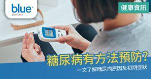 根據香港糖尿聯會統計,目前全港有70多萬人患有糖尿病,到2030年糖尿病人口將會增至92萬人 [1]。因此,了解糖尿病發病原因及預防方法尤其重要,並從日常生活中做出改變,才可避免或延緩發病機率。Blue健康達人將說明糖尿病初期症狀,幫助你及早判斷及治療糖尿病,降低嚴重併發症風險。 什麼是糖尿病? 人體中的胰臟功能之一是分泌胰島素,以調節體內糖份代謝,當胰島素分泌正常時,血液中的葡萄糖可以順利進入肝臟等身體細胞中,進而產生能量,同時令血糖濃度維持在一定範圍。然而,當胰島素分泌不足,或身體無法正常發揮胰島素作用時,血液中的葡萄糖則無法正常代謝而留在血液中,將導致血糖值上升,引發糖尿病。 糖尿病3大類型 糖尿病主要分為一型和二型,亦有其他特殊類型的糖尿病,包括妊娠糖尿病。不論類型,所有糖尿病均是因爲葡萄糖無法正常進入細胞,累積在血液中引起。 糖尿病 說明 一型糖尿病 體內免疫系統攻擊和破壞胰島素細胞,使胰島素無法生產或正常作用,並不是由飲食或生活方式引起。一型糖尿病通常發病於兒童和年輕人,但可在任何年齡發病。 二型糖尿病 最常見的糖尿病類型。身體無法分泌足夠的胰島素,或體內細胞對胰島素沒有正常反應(胰島素阻抗),通常與體重過重有關,且多出現於成年人,但任何的年齡層人士均可能發病。 妊娠糖尿病 懷孕期間胎盤會分泌荷爾蒙來幫助胎兒成長,而這些荷爾蒙會阻礙胰島素起作用。若身體同時出現胰島素阻抗,胰島素不足以將血液中葡萄糖帶入細胞,就會導致妊娠糖尿病。通常罹患過妊娠糖尿病的女性,日後罹患二型糖尿病的風險更高。 糖尿病初期症狀 糖尿病初期通常是指血糖值高於正常範圍,但尚未達到確診的標準。由於糖尿病症狀初期較不明顯,容易與日常疲勞與老化混淆,因此觀察身體細微變化相當重要,及早識別糖尿病初期症狀,有助於阻止糖尿病進一步發展。 典型的糖尿病初期症狀常以「三多一少」為代表: 喝多:經常口渴,需大量喝水 吃多:食量增加,但仍常感飢餓 尿多:頻繁排尿,尤其在夜間更明顯 體重減輕:即使食量正常或增加,體重卻持續下降 除了這些徵兆,若發現自己容易疲勞、傷口難以癒合、視力模糊、皮膚暗沉及乾癢等情況,這些亦可能是糖尿病初期症狀的表現,建議盡早就醫評估 [2]。 糖尿病常見症狀 糖尿病最常見的症狀同樣是口渴、小便頻繁、疲倦和體重減輕,但亦有可能出現其他糖尿病症狀,若懷疑自己罹患糖尿病,務必儘早進行檢查。 經常口渴、口乾 頻繁小便,尤其在夜間 容易感到疲倦或沒精神 體重無故減輕 視力模糊 傷口癒合速度變慢 尿道或皮膚等反覆感染 手腳麻痺、刺痛感或感覺異常 [3] 糖尿病原因及高危族群 糖尿病的根本原因在於胰島素分泌不足或身體對胰島素反應變差,導致無法有效調節血糖。這些生理變化背後,受到多種生活與遺傳因素影響,以下是糖尿病常見的發病原因與高風險族群,應更留意健康狀況,及早採取預防措施。 體重過重或肥胖 脂肪組織過多特別是內臟脂肪,會干擾胰島素的運作,降低細胞對胰島素的敏感度,引發胰島素阻抗,讓血糖難以進入細胞被利用,是二型糖尿病最常見的原因之一。 缺乏身體活動 運動不足會使肌肉細胞對胰島素的反應變差,降低身體處理葡萄糖的效率,也使多餘的糖分更容易在血液中累積,長期下來可能導致血糖異常和糖尿病。 有家族糖尿病病史 若父母或兄弟姊妹直系親屬中有糖尿病患者,會更可能有影響胰島素分泌或作用的基因變異,使得本身的胰臟功能較容易失調,較早出現糖尿病症狀,需定期檢測血糖並留意生活習慣。 年齡超過45歲 年齡亦是促使糖尿病發作的原因之一。隨著年齡增長,身體的新陳代謝速度會變慢,胰島素敏感度也會下降,使血糖調控能力變差,因此45歲以上族群為糖尿病的高風險對象。 胰臟功能異常或曾患妊娠糖尿病 曾罹患胰臟疾病(如胰臟炎、胰臟手術)或女性於懷孕期間出現妊娠糖尿病者,胰島素分泌功能可能較弱,導致血糖控制困難,進一步增加發病風險 [4]。 糖尿病併發症 若長期血糖水平過高,會損害血管及神經,進而影響身體其他部位,造成短期或長期併發症。最常見的長期併發症是心血管疾病以及視網膜病變,嚴重可能造成失明。而短期(急性)併發症,如糖尿病酮酸中毒症(DKA),更可能導致死亡,及時診斷並治療糖尿病才能有效預防或延緩併發症。以下為糖尿病常見併發症狀: 中風、心臟病、高血壓等心血管疾病 視網膜病變、視力模糊、失明 腎功能衰退 手腳麻痺、刺痛或感覺遲鈍 足部傷口不易癒合,嚴重可能須截肢 牙齦發炎、牙齒鬆動 男性勃起困難,女性陰道感染風險上升 抑鬱、焦慮等情緒困擾 [5] 如何診斷糖尿病?一型、二型糖尿病診斷方法 若擔心自己罹患糖尿病,或已出現糖尿病初期症狀,可以接受血液檢查,測量血糖及糖化血紅素(HbA1c)。一般醫生會要求在禁食8至12小時後檢測(空腹測試)或用餐後檢測。若血糖值高於以下標準,即可診斷為糖尿病: 空腹檢測 7.0 mmol/L 餐後2小時檢測 11.1 mmol/L 糖化血紅素達 6.5% 以上 [6] 延伸閱讀:飯後血糖正常值是多少?正常血糖指數及降血糖最快的方法 如何診斷糖尿病?妊娠糖尿病診斷方法 為了檢測孕婦是否罹患妊娠糖尿病,醫生會要求進行口服葡萄糖耐量測試(OGTT)。檢測時孕婦需要先抽血確認空腹血糖值,並在喝下葡萄糖溶液後2